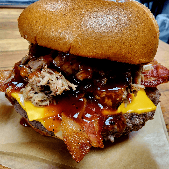 A half-pound, Prime Grade patty cooked to order, topped with Muenster and American Cheese, 2 strips of Hickory Smoked Bacon, your choice of our house pulled pork or beef brisket, and a splash of BBQ sauce