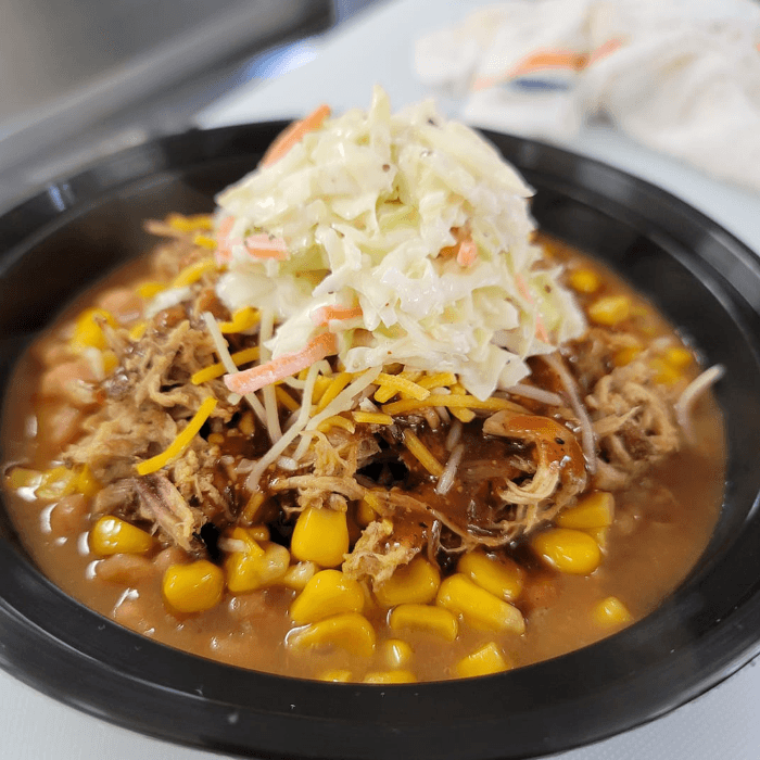 Layered with mashed potatoes, baked beans, corn, pork, cheese, sauce, and slaw